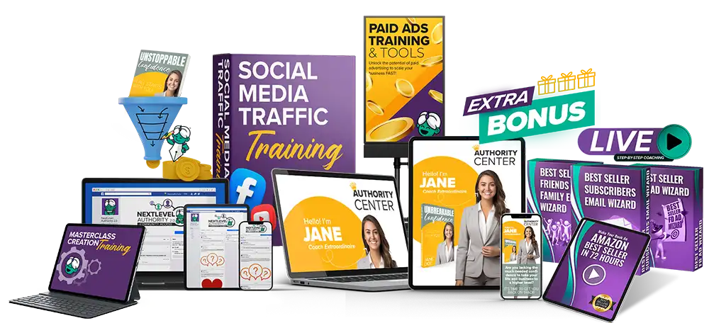 With the Next Level Authority Version 2.0 program, you'll also gain access to valuable tools and STEP-BY-STEP, paint-by-numbers training on website creation, book funnels, masterclass creation, paid ads, social media traffic… and MORE!